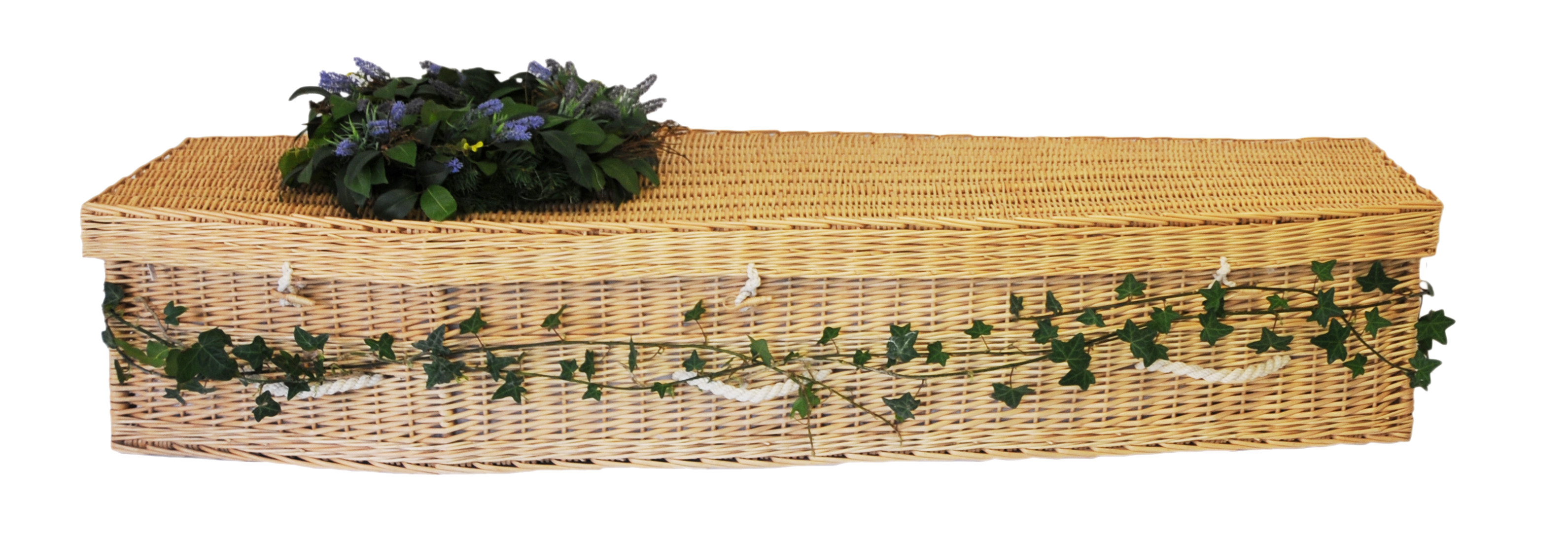 A wicker coffin fully furnished with rope handles suitable for burial or cremation. The coffin is lined with soft natural fabric and includes a ply name plate.