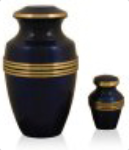 The Athena Urn is hand-cast in brass with a rich blue finish featuring gold-banded detail. This urn measures 26.5 cm tall by 15cm wide and will hold the full ashes of an adult.